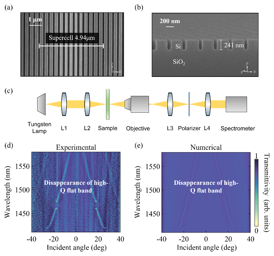 为验证理论结果,研究团队首先制备了具有镜面对称无序(基于上述理论方法随机产生)的一维光子晶体样品(图4a-4b),并分别通过角分辨透射谱(图4c)与等频率面成像(图5a)两种方法对样品进行观测。在观测角分辨透射谱时(图4d-4e),可以看到角分辨透射谱与仿真计算的能带结构基本相符,但平带结果并未观测到,这是由于该谱线仪的可分辨波长大于高Q值模式的谱线线宽,只能观测到Q值较低的模式,侧面证实了quasi-BFICs的存在。