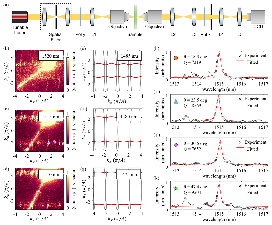 对于quasi-BFICs的直接实验观测则由等频率面成像系统给出。该系统通过波长可调激光器作为光源,对不同波长下动量空间的等频率谱进行激发,基于激光良好的单频性,直接观测到了quasi-BFICs对应的等频率线(双平行线线型),并与仿真结果符合良好(图5b-5g)。进一步通过散射光谱测量,发现在入射角从18.3°至47.4°的宽范围内,共振Q值均稳定在8000左右(图5h-5k),远优于传统BIC在偏离Γ点后急剧下降的Q值。