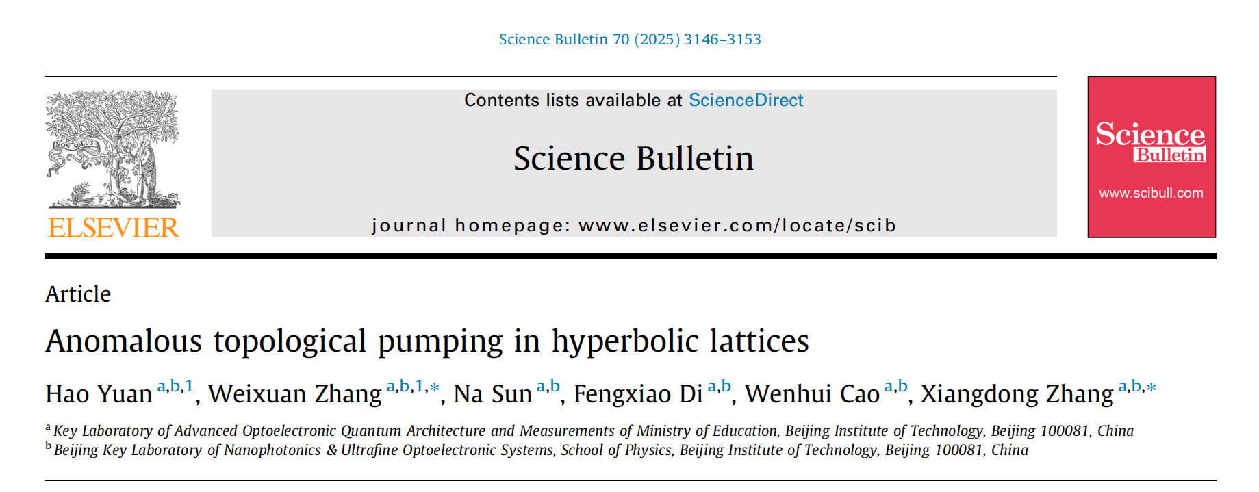 日前,北京理工大学物理学院张向东教授课题组在拓扑电路和双曲晶格拓扑泵浦研究领域取得突破性进展。研究团队首次理论提出并证明了双曲晶格中拓扑泵浦的新机制,设计并制备时变拓扑电路,在实验上观测到兼具高维量子霍尔效应特性与周期边界条件(PBC)依赖的双曲拓扑泵浦现象。相关成果发表于Science Bulletin(Sci. Bull. 70 (2025) 3146–3153),研究工作获国家重点研发计划和国家自然科学基金资助。物理学院袁昊博士(2020级)和张蔚暄教授为论文共同第一作者,张向东教授和张蔚暄教授为通讯作者。
