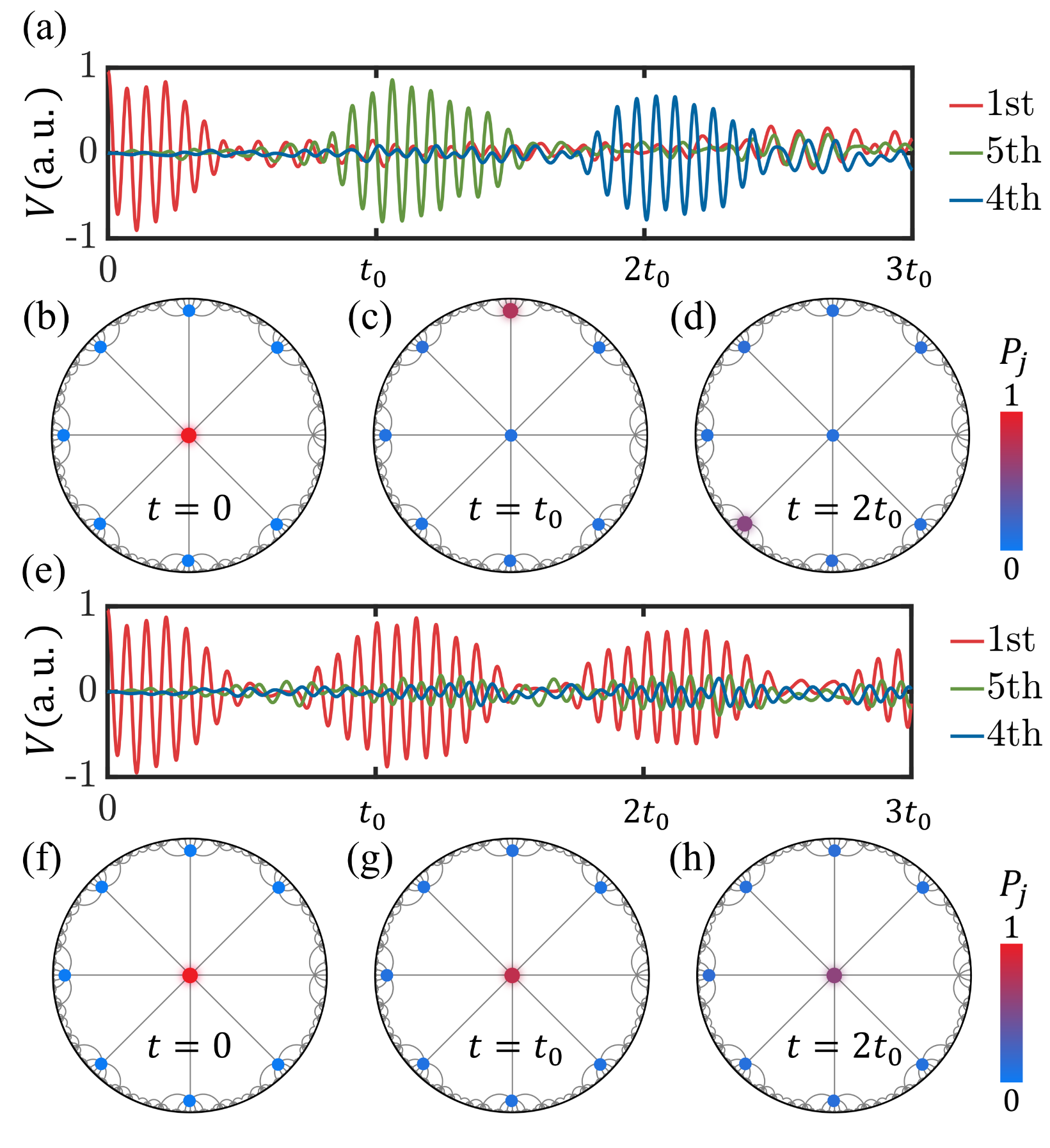 进一步通过计算并对比不同PBC下的格点电压演化,分别观测到跨越原胞的泵浦输运(图4a-d)和拓扑振荡现象(图4e-h)。这些结果严格验证了高维量子霍尔响应在双曲晶格的存在性,并揭示非欧几何通过PBC设计调控拓扑动力学的独特能力。