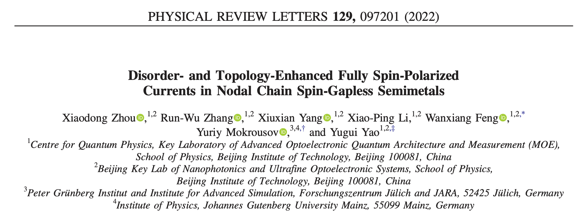 Xiaodong Zhou, Run-Wu Zhang, Xiuxian Yang, Xiao-Ping Li, Wanxiang Feng*, Yuriy Mokrousov*, and Yugui Yao*, “Disorder- and Topology-Enhanced Fully Spin-Polarized Currents in Nodal Chain Spin-Gapless Semimetals”, Phys. Rev. Lett. 129, 097201 (2022). (*为通讯作者)