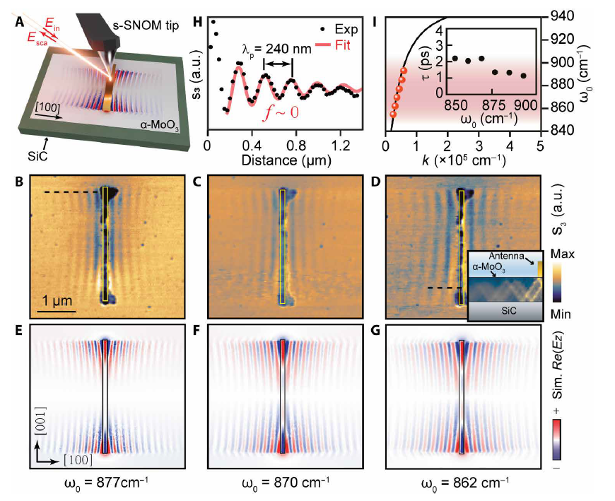 图2展示了碳化硅衬底上氧化钼材料中极化激元的近场光学图像。研究人员基于纳米级空间分辨率的红外近场光学成像技术对极化激元传播行为进行实空间成像。图A给出了红外纳米成像的示意图,通过金属纳米天线激发氧化钼中的极化激元,针尖逐点扫描将近场信号散射到远场探测器,最后获得实空间图像。图B-D分别是不同入射光波数下极化激元的实空间成像,极化激元沿着水平方向高度定向传播,即非衍射传播。图E-G为相应的数值模拟结果,与实验结果符合良好。图H中展示了极化激元传播的波形图,可以提取出极化激元非衍射传播的波长。图I给出了非衍射传播极化激元的光学色散和传播寿命。
