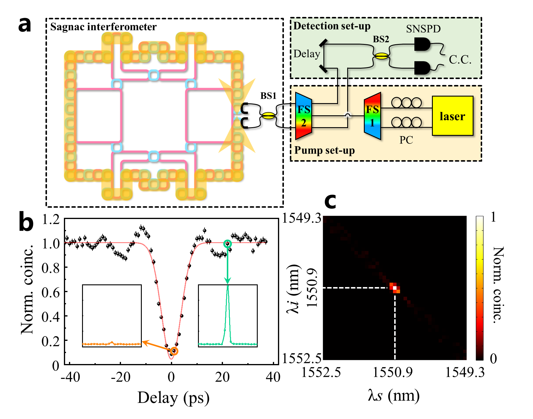 此外,研究人员还测量了泵浦光波长固定在1550.92nm时的联合谱强度(JSI),如图2g所示。在这里,信号和闲频光子被滤波在-3到+3阶FSR的波长范围内。三组非零JSI,分别对应于信号和闲频光子位于-1和+1阶FSR、-2和+2阶FSR以及-3和+3阶FSR的情况。