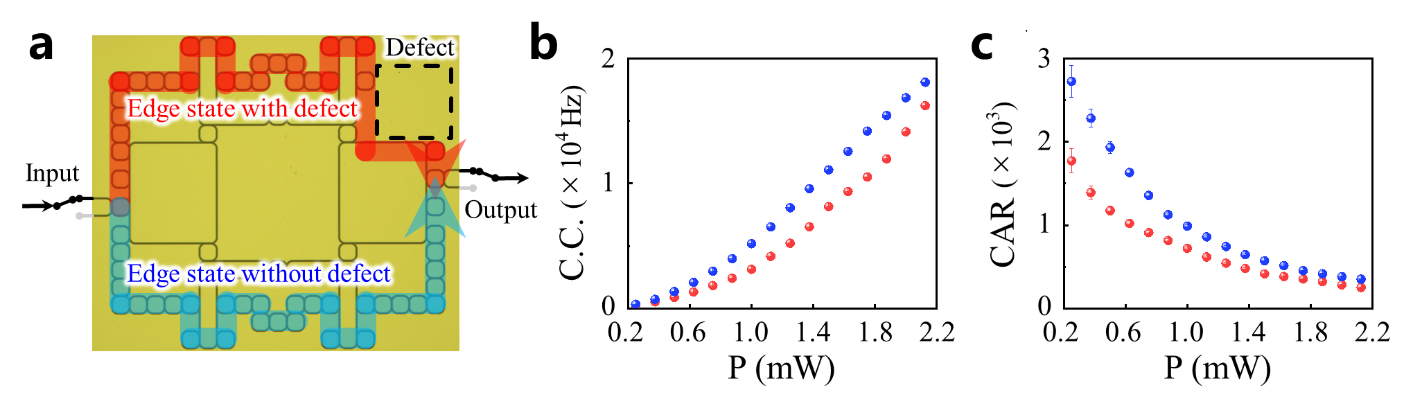 为了验证双曲拓扑量子源的鲁棒性,研究人员还制备了一个有缺陷的样品,如图3a所示。通过选择性地去除双曲结构中的一组环来引入不完美缺陷。在这种特定的缺陷下,预计的信号和闲频光子将沿上方边界生成(如红色箭头所示),并借助拓扑边界态绕过缺陷。在实验中,研究人员使用相同的实验装置(如图2a所示)来测量带有缺陷的双曲拓扑量子源生成的相关双光子态的符合计数。实验结果展示了符合计数与泵光功率的关系,如图3b中的红色点所示。为了与无缺陷的情况进行对比,研究人员还进行了额外的实验,测量了沿下部光路径(如蓝色箭头所示)生成的相关双光子态的符合计数。通过比较可以发现,双曲拓扑量子源的亮度保持在一致的水平,不受缺陷影响,这证明了其对缺陷的鲁棒性。此外,研究人员还研究了CAR随输入功率变化的情况,如图3c所示。值得注意的是,即使在双曲拓扑量子源中存在缺陷,它仍然能够实现高CAR值(>1800)。因此,可以得出结论,双曲拓扑量子源对缺陷表现出显著的抗性。这些实验结果与理论分析相符。