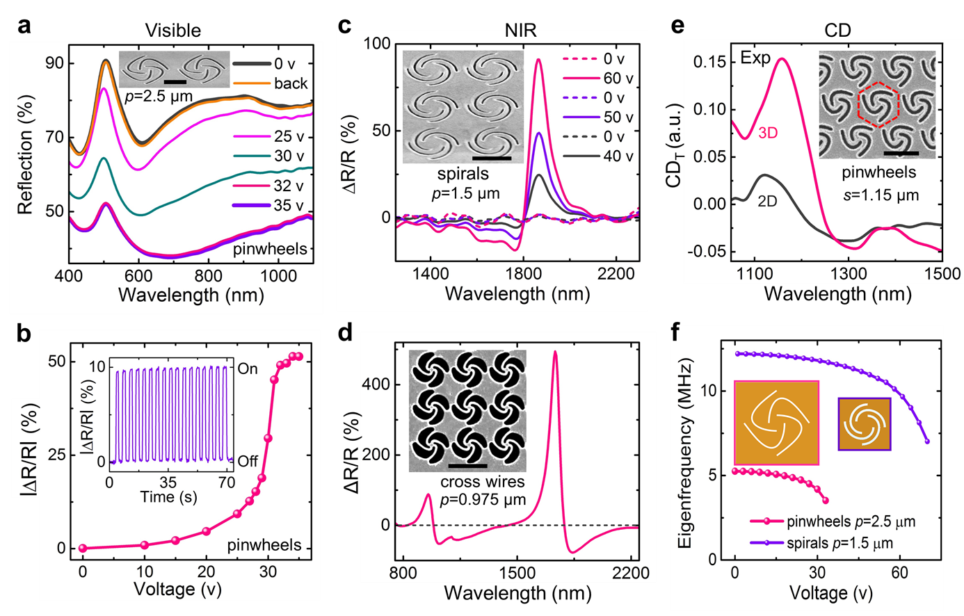图2: (a,b) 可见光波段风车结构的宽带调谐特性;(c,d)近红外波段螺旋线和交叉线结构的光学共振动态调谐特性;(e)实验测得三臂风车结构形变前后的圆二色谱;(f) 计算所得图a,c两种剪纸结构在不同驱动电压下的本征机械共振频率,结果显示其调制频率可达5-14 MHz。