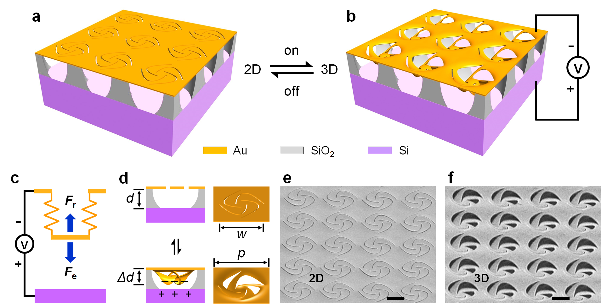 图1: (a-c) 静电力驱动纳米剪纸形变原理图;(d)形变前后结构单元模拟图;(e,f)实验制备的四臂风车阵列施加电压前2D和施加电压后形成3D结构SEM图。比例尺:1 μm。