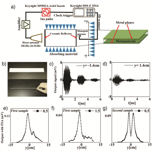 图3 (a)微波实验平台。(b)反射镜。(c)-(g)超材料完成量子搜索算法的实验结果