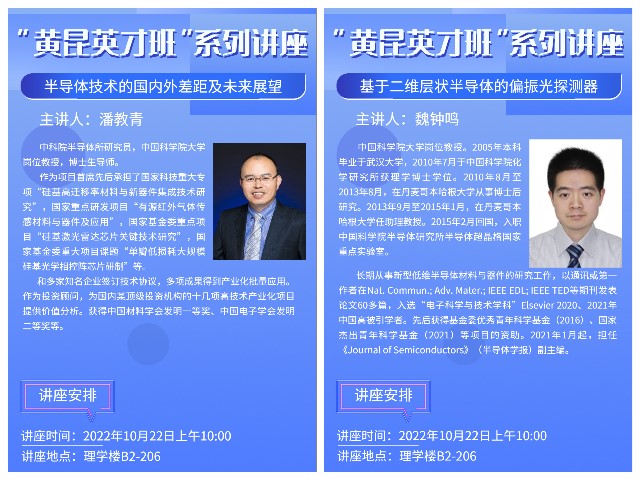 “黄昆英才班”系列讲座(第二期)于2022年10月22日线上线下同步完成。半导体所研究员潘教青、教授魏钟鸣两位老师给同学们带来了精彩的报告。从探讨半导体技术的国内外差距及未来展望,到对二维半导体及光电器件的探索,让同学们了解到芯片是人类工业文明最辉煌的代表成果,它推动了世界在信息化上翻天覆地的变化,同时芯片研发非常难,涉及上千种细分技术领域,约十四种工业大类,需要强大的国家工业基础。希望同学们勇担时代责任,奋发图强,为祖国繁荣富强贡献青春力量。