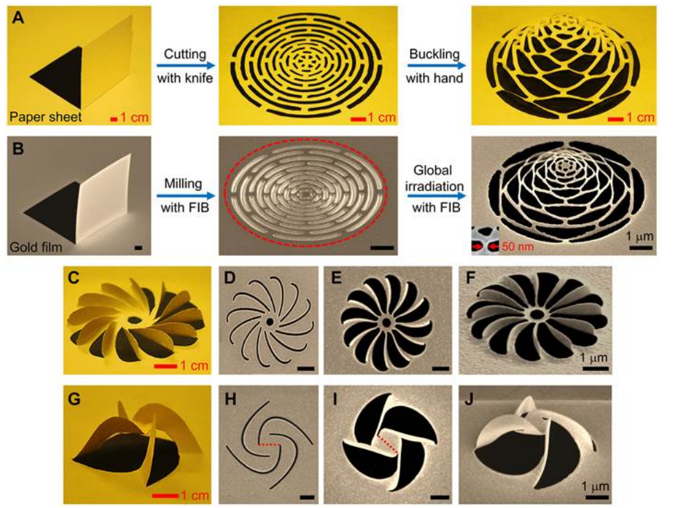 1.三维人工微纳结构制备及功能器件研究1)基于FIB、EBL等工艺的纳米剪纸三维微纳制备技术及光电器件