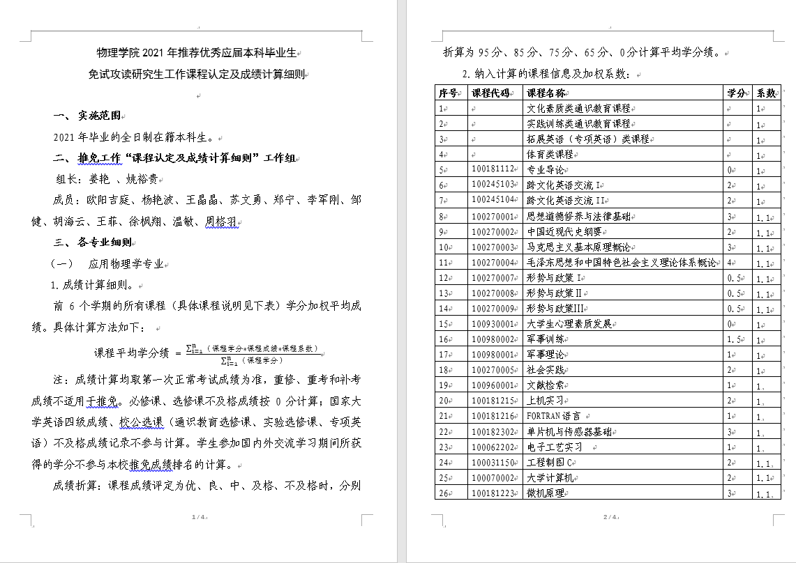 物理学院2021年推荐优秀应届本科毕业生 免试攻读研究生工作课程认定及成绩计算细则