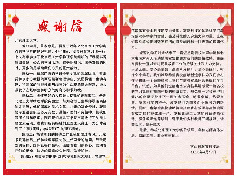 为贯彻落实习近平总书记在主题教育工作会议上的重要讲话精神,全面贯彻党的教育方针,落实立德树人根本任务,物理学院于4月16日至17日联合北京书院邀请山西省方山县科技教育局参与北京理工大学公众科学日活动,赴石景山科技馆参观调研。活动结束后方山县科技教育局发来感谢信,对物理学院在科学普及和教育扶智方面做出的努力表达了衷心的感谢。