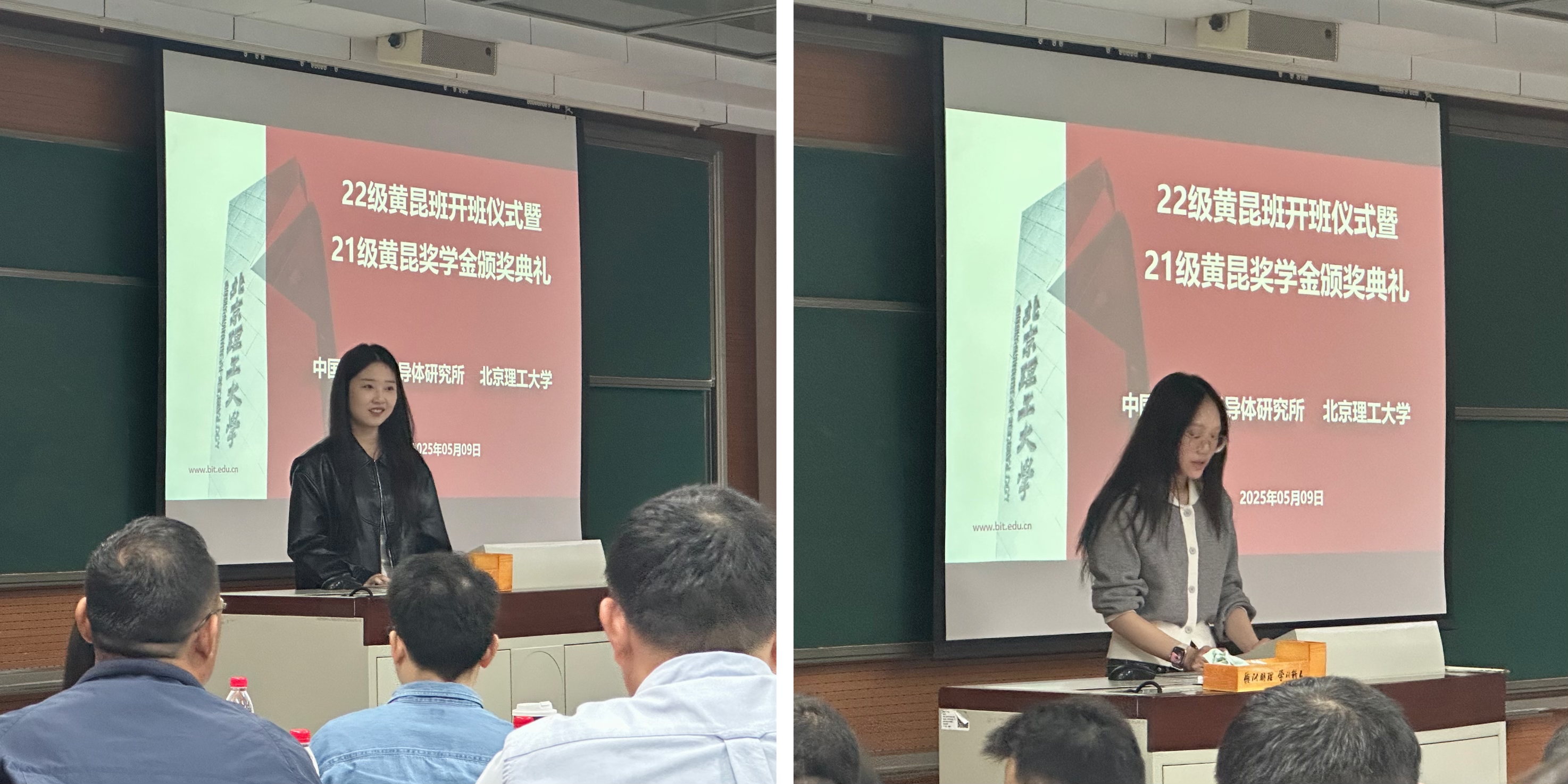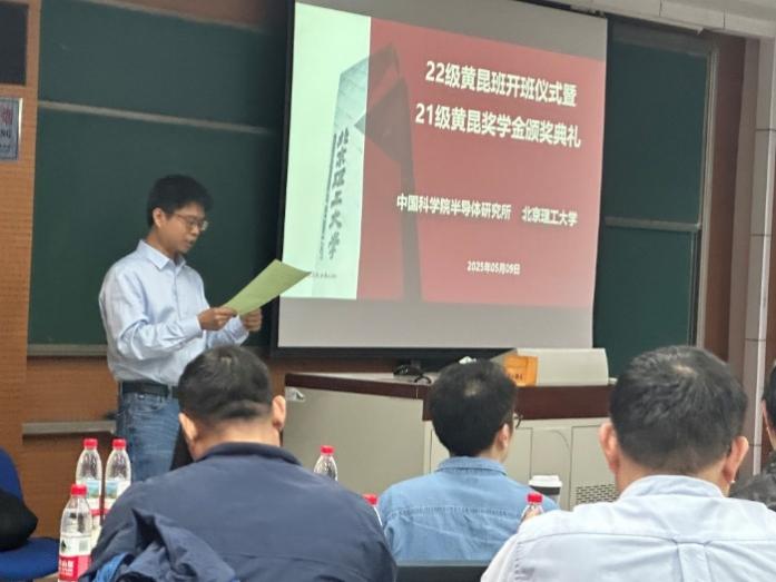 来源: 作者: 发布时间:2025-05-125月9日上午,北京理工大学与中国科学院半导体研究所(以下简称“半导体所”)2021级黄昆班“黄昆奖学金”颁奖典礼,暨2022级黄昆班开班仪式,在北京理工大学良乡校区理学楼C1-106隆重举行。半导体所芯片物理与技术全国重点实验室副主任吴江滨研究员、张菁研究员和张永亮研究员,北京理工大学材料学院钟海政教授、翟华嶂副教授,物理学院李军刚副院长、衡成林副教授,以及2021级和2022级黄昆班学生代表(约50人)参加了本次活动。会议由钟海政教授主持。