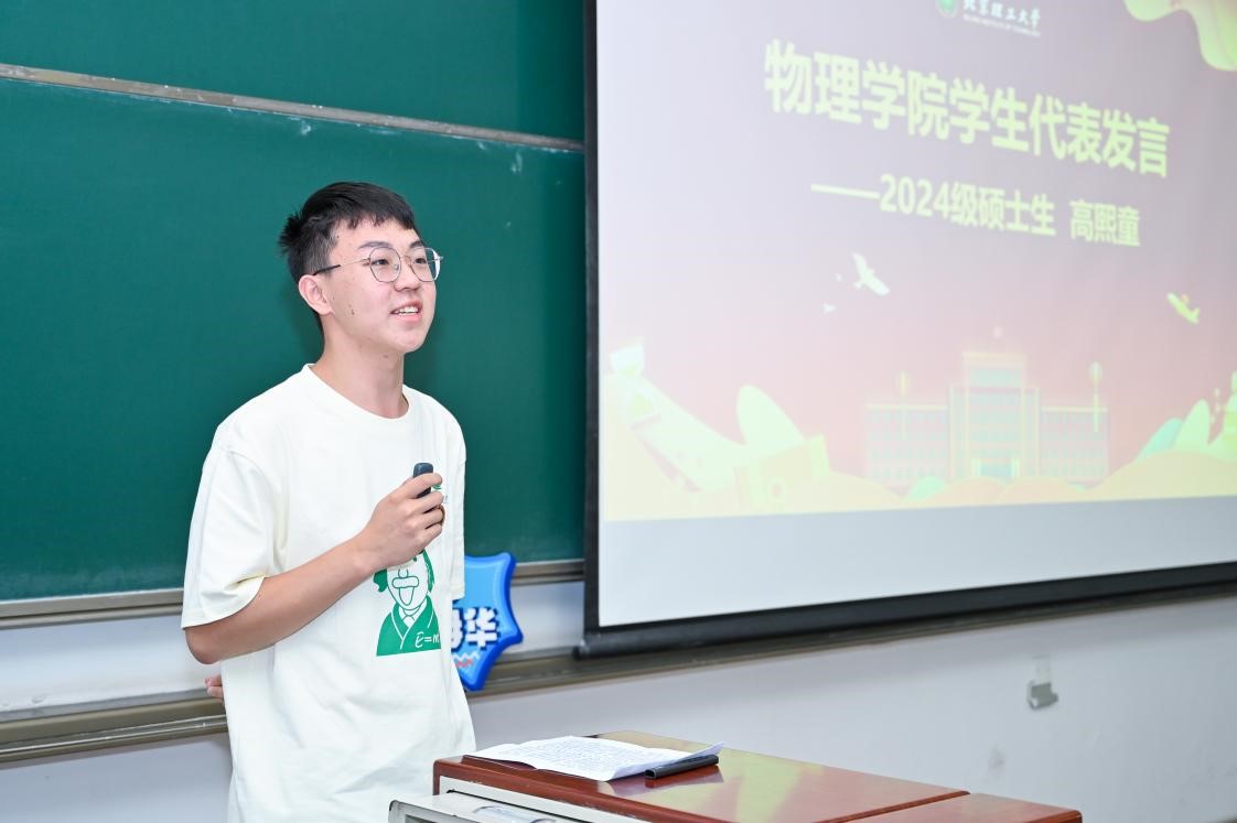2024级硕士生高熙童作为新生代表发言。他表示,作为北理工的一名物理人,要始终秉承“德以明理,学以精工”的校训,牢记“宁拙毋巧 宁朴毋华”的致学精神,在今后的科研学习中,主动探索不断创新,早日成长为自身研究领域的拔尖创新领军人才。