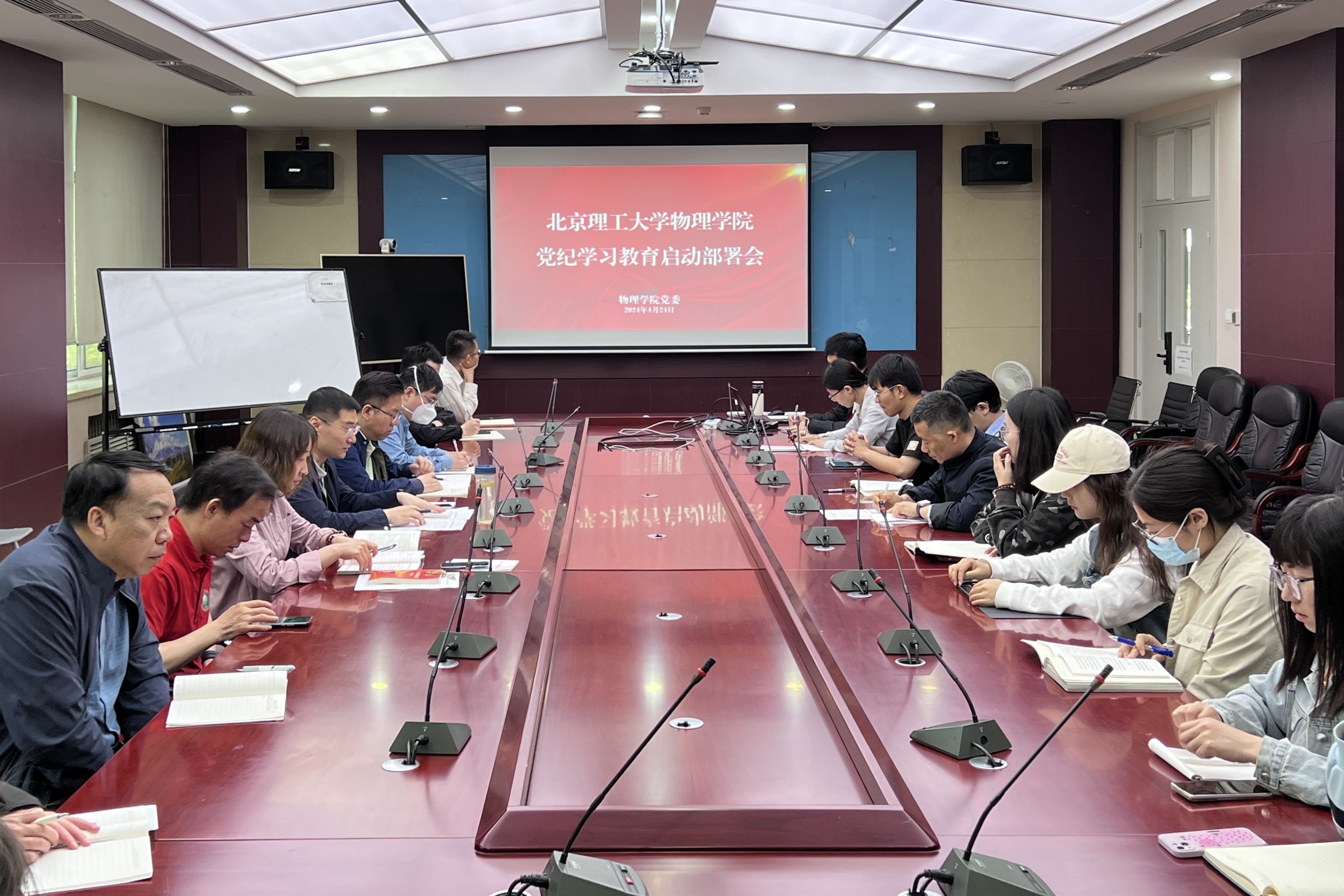 4月24日上午,北京理工大学物理学院召开党纪学习教育启动部署会,学习贯彻习近平总书记关于党纪学习教育的重要讲话和重要指示精神,传达学校党委有关要求,研究部署学院党纪学习教育工作,动员全院党员干部认真落实,做到学纪、知纪、明纪、守纪。学院党委书记陈珂主持会议,学院党委委员、师生党支部书记参加会议。